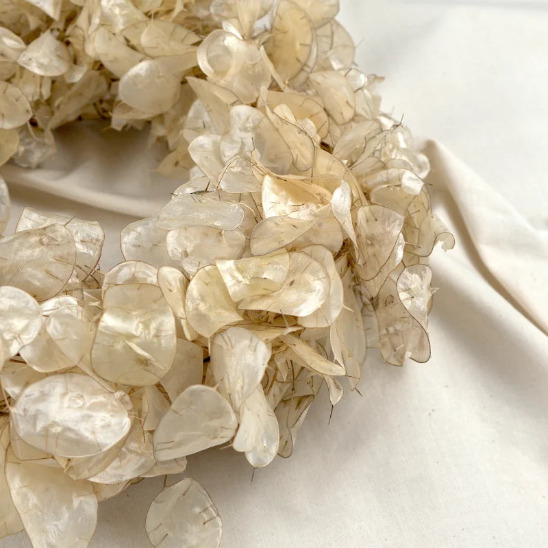 einmaligen Aussehen. Die Blätter haben einen leichten Perlmutt Schimmer, der diesen Kranz einen edlen Touch gibt. Wir haben zwei Varianten im Sortiment, einmal Natur und einmal in einen dezenten Goldschimmer.