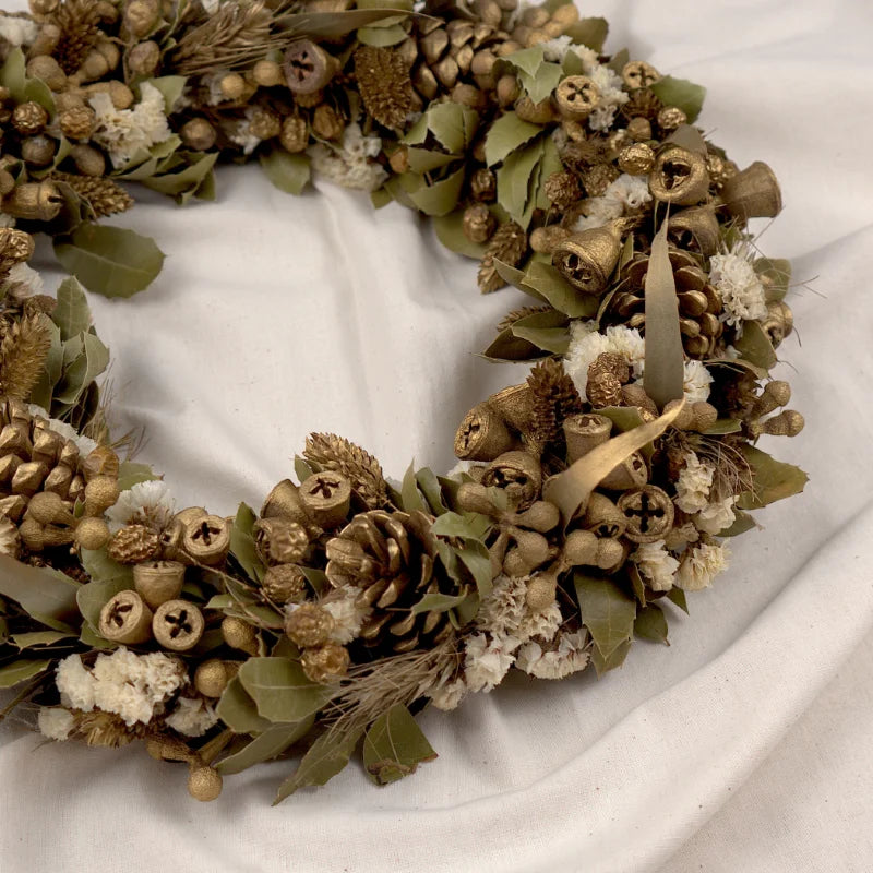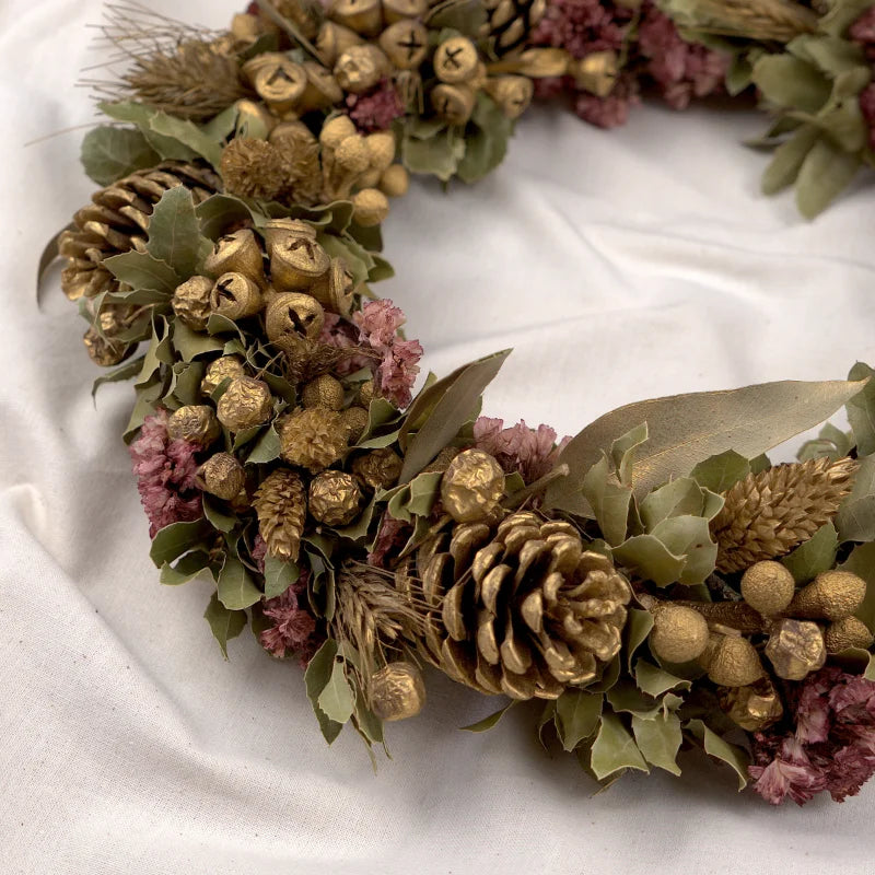 Unsere weihnachtlichen Trockenblumenkränze mit edlen Goldakzenten, sind ein absolutes Highlight. Ob als Adventskranz, Wandkranz oder als Hingucker für deine Weihnachtstafel.